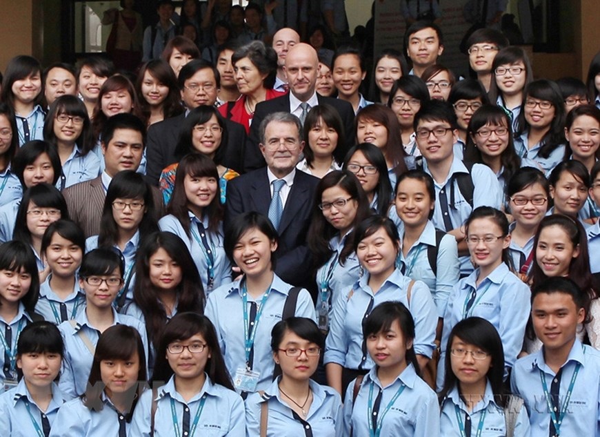 Giáo sư Romano Prodi, nguyên Thủ tướng Italy, nguyên Chủ tịch EC với sinh viên Học viện Ngoại giao tham dự buổi thuyết trình của Giáo sư với chủ đề: “Chính trị và hòa bình-hợp tác trên bình diện toàn cầu trong kỷ nguyên toàn cầu hóa” ở Hà Nội, ngày 18/3/2013. (Ảnh: Lâm Khánh/TTXVN)