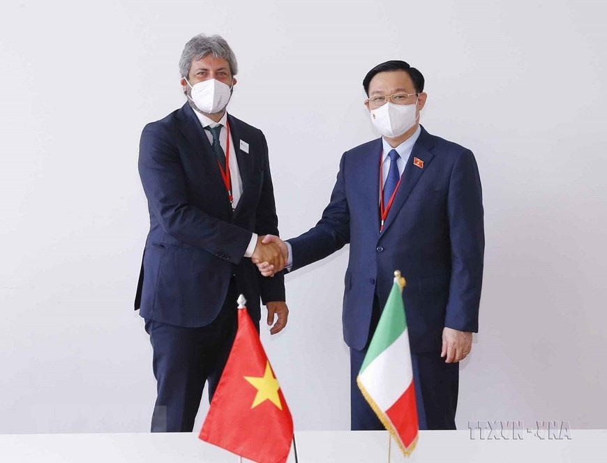 Bên lề Hội nghị các Chủ tịch Quốc hội thế giới lần thứ 5, chiều 7/9/2021, tại Vienna (Áo), Chủ tịch Quốc hội Vương Đình Huệ hội kiến Chủ tịch Hạ viện Itaty Roberto Fico. (Ảnh: Doãn Tấn/TTXVN)