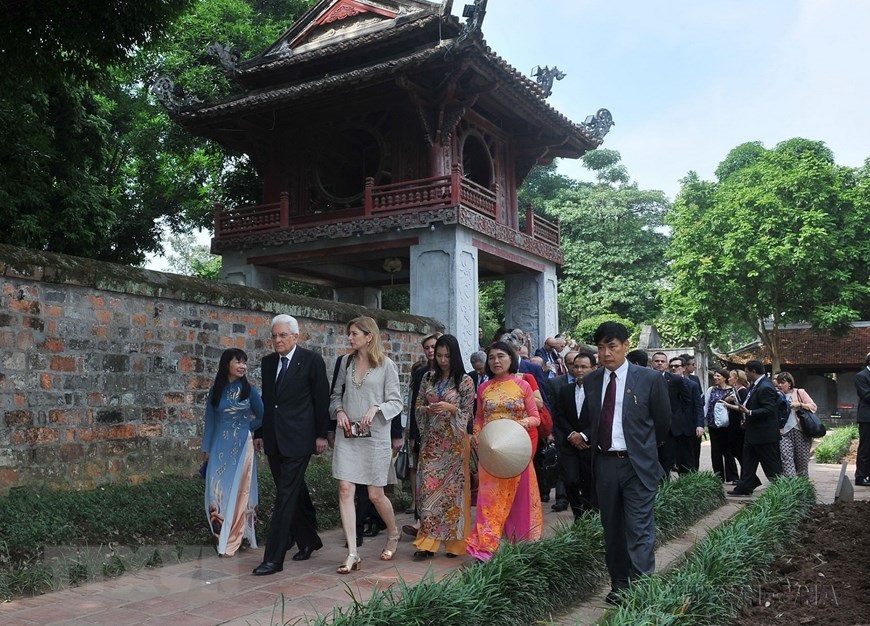 Trong chuyến thăm cấp Nhà nước Việt Nam, sáng 6/11/2015, tại Hà Nội, Tổng thống Italy Sergio Mattarella đến thăm Khu Di tích Văn Miếu-Quốc Tử Giám. (Ảnh: Trọng Đức/TTXVN)