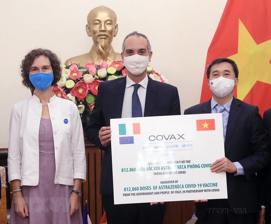 Thứ trưởng Bộ Y tế Trần Văn Thuấn tiếp nhận tượng trưng 812.060 liều vaccine AstraZeneca do Chính phủ và nhân dân Italy ủng hộ Việt Nam, Hà Nội, ngày 14/9/2021. (Ảnh: Lâm Khánh/TTXVN)