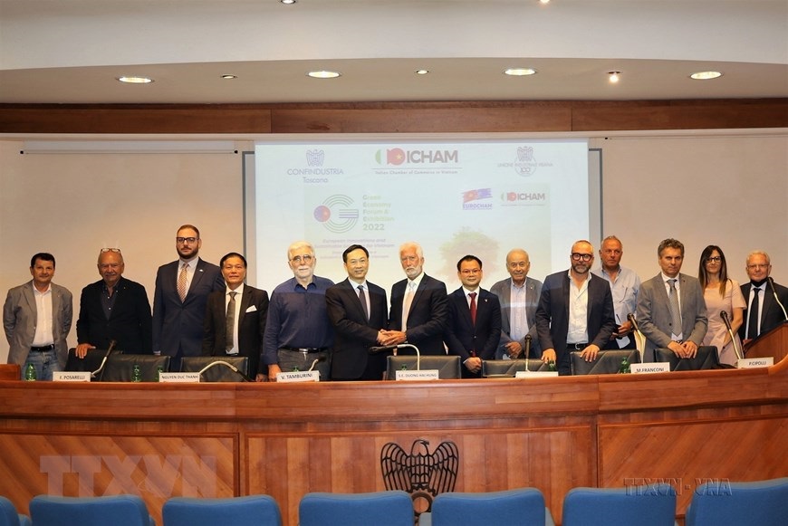 Hội thảo Hợp tác kinh tế Việt Nam - Italy với chủ đề "Việt Nam-Điểm đến kinh doanh và đầu tư của các doanh nghiệp Italy" do Liên đoàn Công nghiệp tỉnh Pisa và Phòng Thương mại Italytại Việt Nam (ICHAM) phối hợp tổ chức, ngày 5/7/2022. (Ảnh: Trường Dụy/TTXVN)