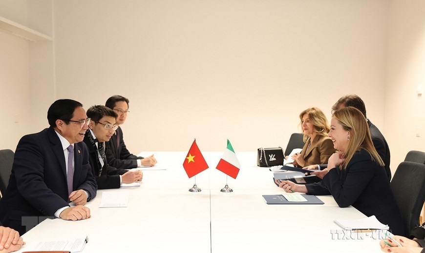 Nhân chuyến tham dự Hội nghị cấp cao kỷ niệm 45 năm quan hệ ASEAN-EU tại Brussels, chiều 14/12/2022, Thủ tướng Phạm Minh Chính gặp Thủ tướng Italy Giorgia Meloni. (Ảnh: Dương Giang/TTXVN)