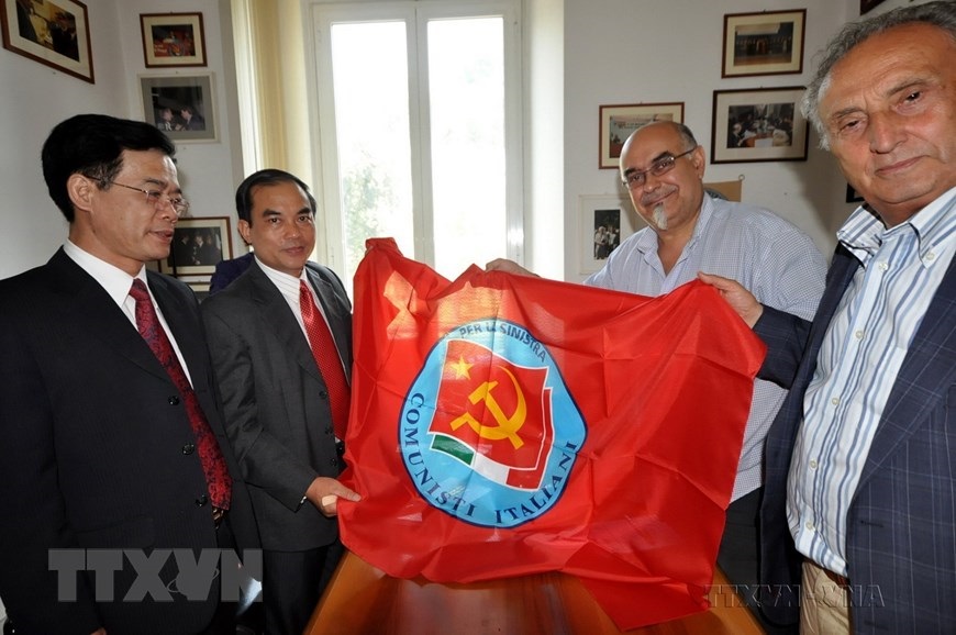 Buổi làm việc giữa Đoàn Tạp chí Cộng sản do Phó Giáo sư-Tiến sỹ, Tổng Biên tập Vũ Văn Phúc dẫn đầu với lãnh đạo Đảng Những người Cộng sản Italy (PCI) trong chuyến thăm và làm việc tại Italy từ ngày 14-16/7/2013. (Ảnh: Minh Đức/TTXVN)