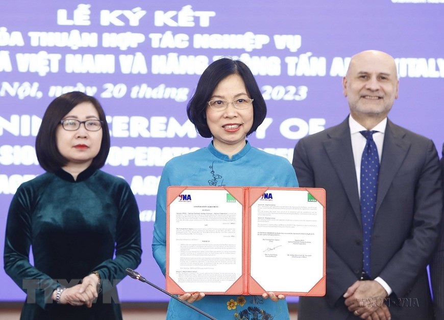Tổng giám đốc TTXVN Vũ Việt Trang ký trực tuyến Thỏa thuận hợp tác nghiệp vụ giữa TTXVN và hãng Thông tấn ANSA của Italy, 20/2/2023. (Ảnh: An Đăng/TTXVN)