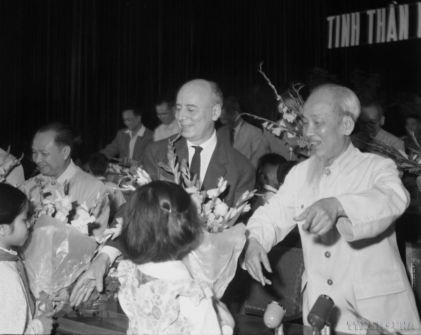Chủ tịch Hồ Chí Minh và Ủy viên Ban lãnh đạo, Bí thư thứ nhất BCH Trung ương Đảng Cộng sản Italy Giancarlo Pajetta tham dự míttinh của nhân dân Thủ đô kỷ niệm ngày Quốc tế lao động và chào mừng Đoàn đại biểu Đảng Cộng sản Italy thăm hữu nghị Việt Nam, 1/5/1965. (Ảnh: TTXVN)