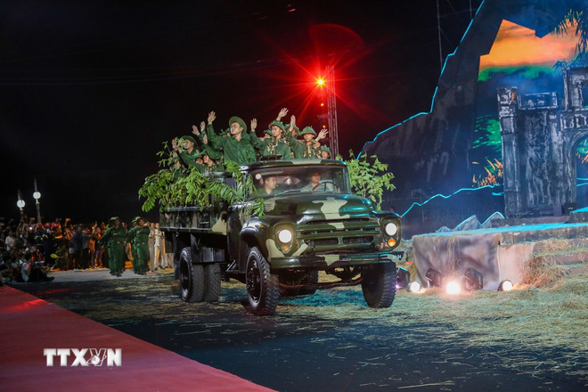 Chương trình nghệ thuật tái hiện các giai đoạn lịch sử hào hùng của tỉnh Tây Ninh. (Ảnh: Giang Phương/ TTXVN)