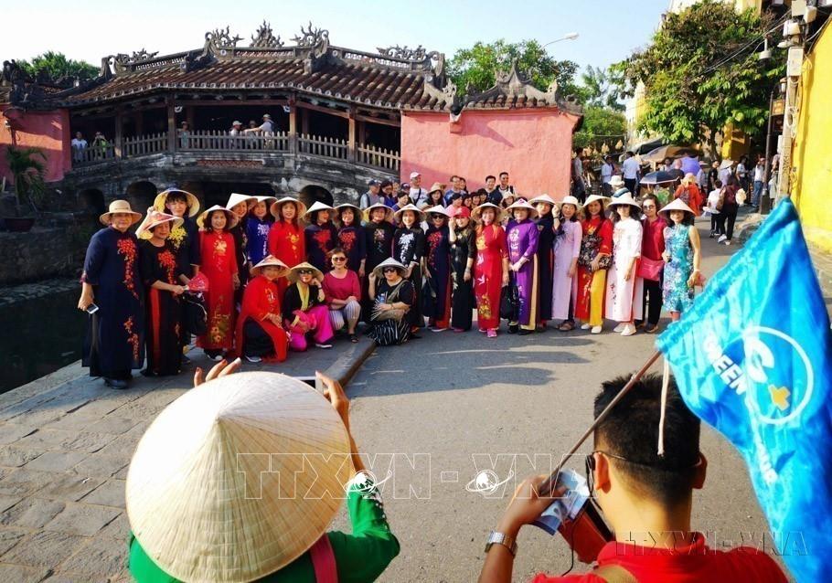 Ngành du lịch Việt Nam chuyển mình mạnh mẽ, sang một ngành công nghiệp hiện đại, có năng lực cạnh tranh quốc tế, từng bước xây dựng được thương hiệu "Việt Nam - điểm đến an toàn, thân thiện, hấp dẫn. Trong ảnh: Đoàn khách quốc tế chụp ảnh lưu niệm bên Chùa Cầu, Hội An. Ảnh: Thanh Tùng - TTXVN
