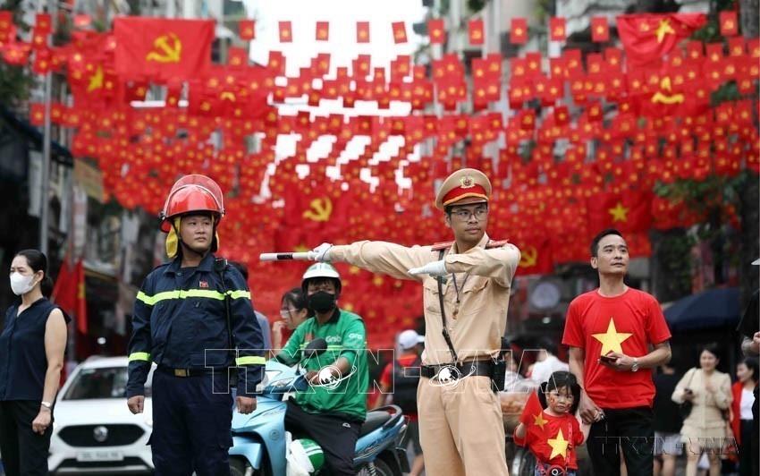 Cán bộ, chiến sĩ CSGT làm nhiệm vụ phân luồng, điều tiết giao thông tại tuyến phố Nguyễn Thái Học - Hùng Vương, Đảm bảo tuyệt đối ANTT và ATGT cho sự kiện A80 (21/8/2025). Ảnh: Phạm Kiên - TTXVN
