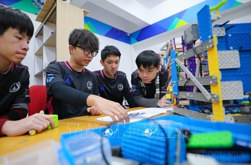 Đội tuyển VEX IQ - Trường THPT Chuyên Hà Nội - Amsterdam tập luyện cho Giải vô địch thế giới VEX Robotics 2024. Ảnh: Thanh Tùng - TTXVN
