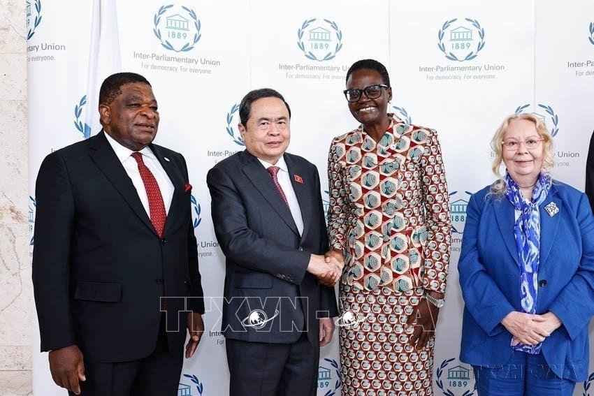 Chủ tịch IPU Tulia Ackson và Tổng Thư ký IPU Martin Chungong đón Chủ tịch Quốc hội Trần Thanh Mẫn dự Lễ khai mạc Hội nghị các Chủ tịch Quốc hội Thế giới lần thứ 6 (Thuỵ Sĩ,29/7/2025). Ảnh: Doãn Tấn – TTXVN