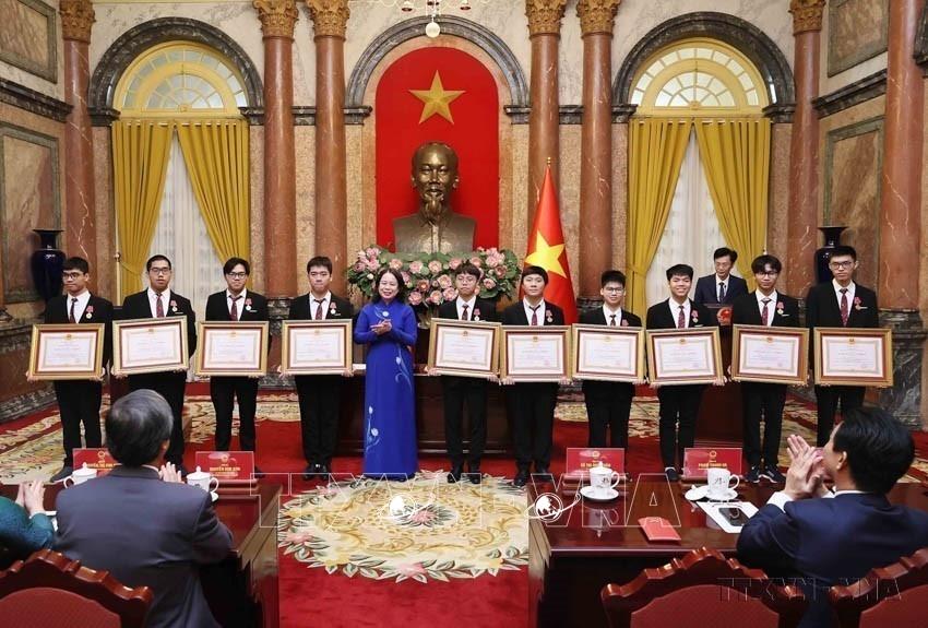 Phó Chủ tịch nước Võ Thị Ánh Xuân gặp mặt và trao Huân chương Lao động cho học sinh đoạt giải Olympic và khoa học kỹ thuật quốc tế (Hà Nội, 28/12/2024). Ảnh: An Đăng - TTXVN