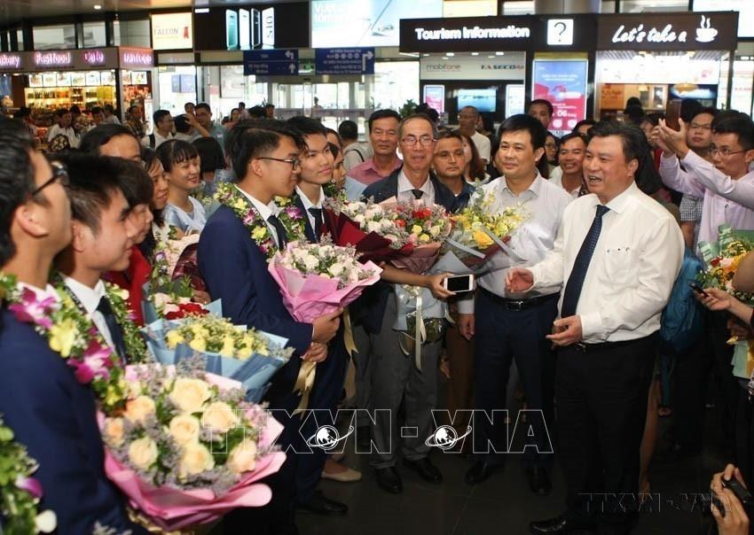 Bộ Giáo dục và Đào tạo tổ chức đón đoàn học sinh đạt thành tích xuất sắc tại kỳ thi Olympic Toán quốc tế (IMO) 2019, tổ chức ở Vương quốc Anh. Với thành tích này, Việt Nam xếp thứ 7 trong số 110 quốc gia, vùng lãnh thổ dự thi. Ảnh: Thanh Tùng-TTXVN