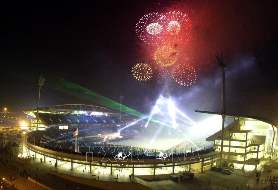 Bắn pháo hoa chào mừng Đại hội Thể thao Đông Nam Á (Sea Games 22), lần đầu tiên tổ chức tại Việt Nam (2003). Ảnh: TTXVN