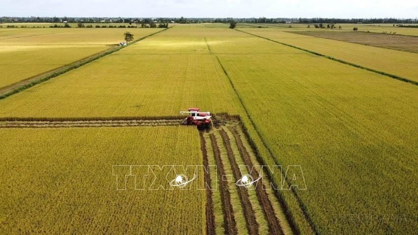 Nông nghiệp Việt Nam phát triển theo hướng hiện đại, bền vững, áp dụng khoa học công nghiệp, đổi mới sáng tạo để tăng năng suất, chất lượng. Trong ảnh: Thu hoạch lúa thí điểm của Đề án sản xuất lúa chất lượng cao, phát thải thấp ở Đồng Tháp. Ảnh: Nhựt An - TTXVN