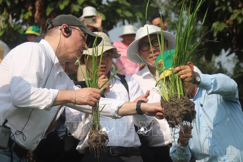 Đoàn công tác Ngân hàng Thế giới (WB) đến thăm vùng sản xuất lúa chất lượng cao, phát thải thấp tại Hợp tác xã New Green Farm, quận Thốt Nốt, thành phố Cần Thơ. Ảnh: Thu Hiền - TTXVN