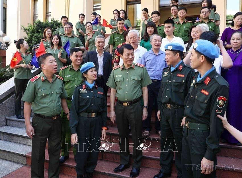 Thượng tướng Lương Tam Quang, Bộ Công an tổ chức Chương trình Gặp mặt các sĩ quan Công an nhân dân lên đường thực hiện nhiệm vụ gìn giữ hòa bình Liên hợp quốc tại Nam Sudan. Ảnh: Phạm Kiên - TTXVN