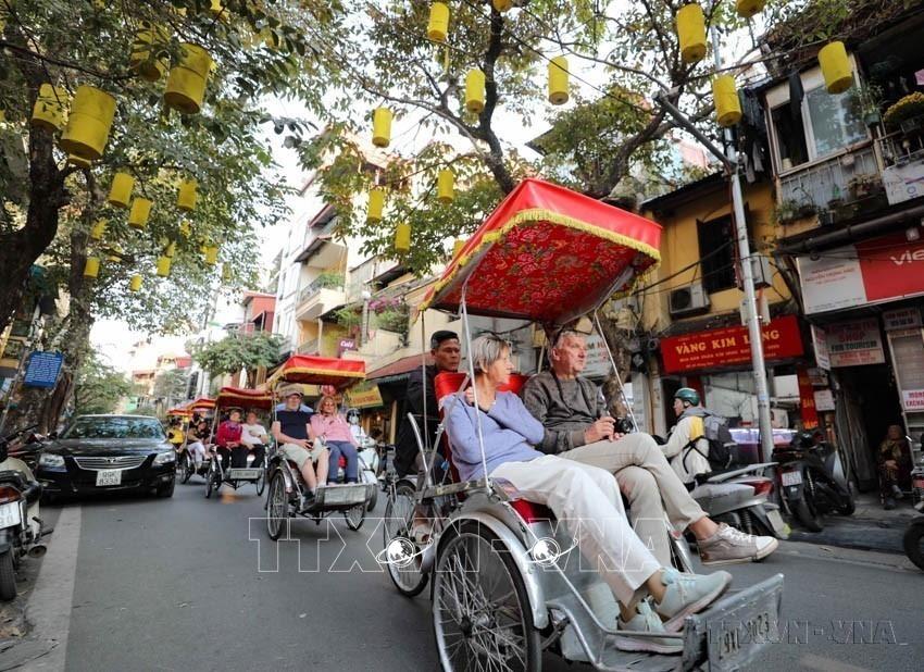Ngành du lịch đã chuyển mình mạnh mẽ, sang một ngành công nghiệp hiện đại, có năng lực cạnh tranh quốc tế, từng bước xây dựng được thương hiệu "Việt Nam - điểm đến an toàn, thân thiện, hấp dẫn. Trong ảnh: Du khách nước ngoài sử dụng xích lô thưởng ngoạn nét đẹp cổ kính của Phố cổ Hà Nội. Ảnh: Thanh Tùng - TTXVN •