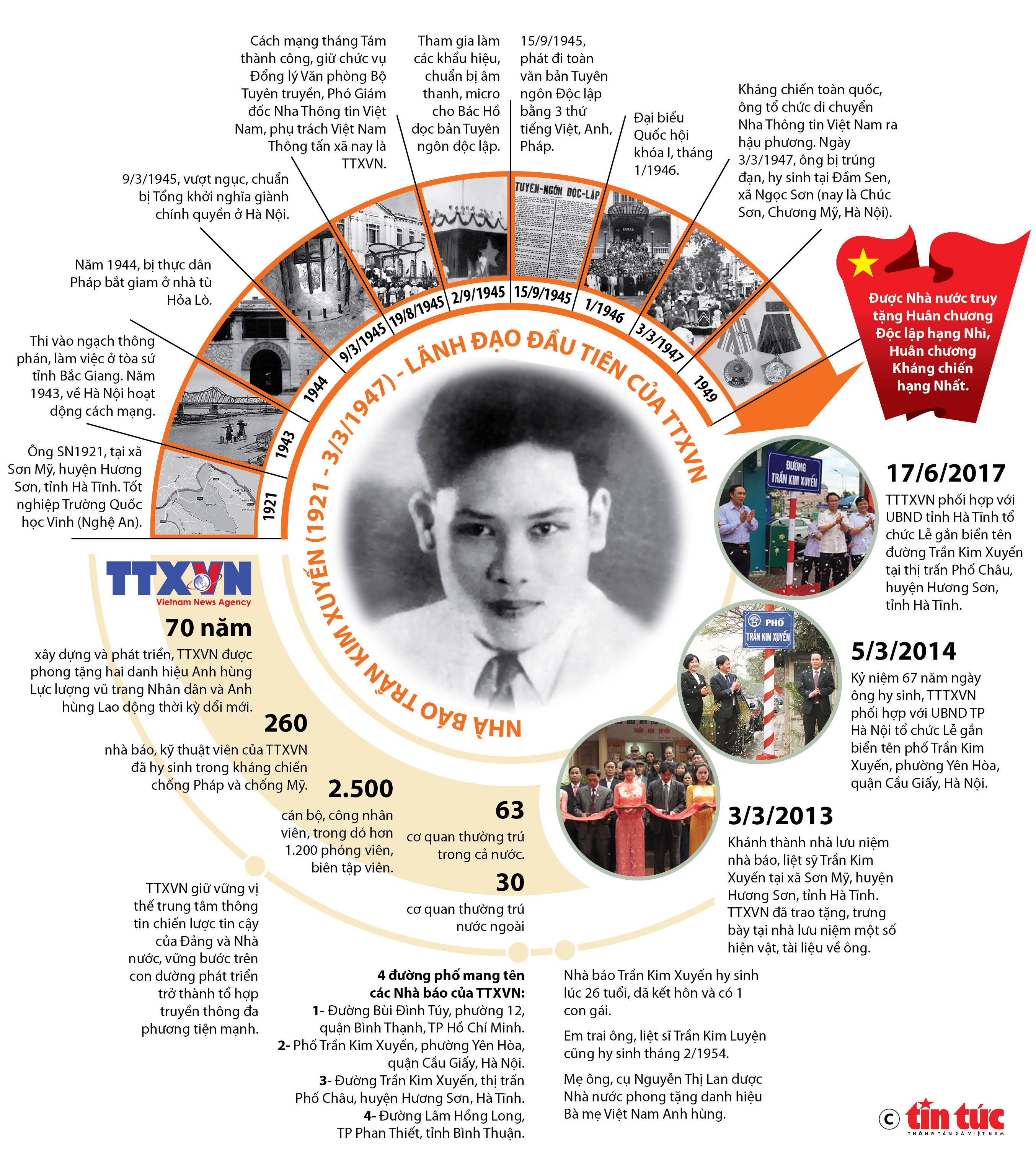 Nhà báo - liệt sỹ Trần Kim Xuyến là lãnh đạo đầu tiên của Việt Nam Thông tấn xã (VNTTX), nay là TTXVN. Sinh năm 1921 tại Hà Tĩnh, Trần Kim Xuyến tham gia hoạt động cách mạng từ khi còn rất trẻ, năm 1944, ông bị thực dân Pháp bắt giam ở nhà tù Hỏa Lò. Sau khi Nhật đảo chính Pháp ngày 9/3/1945, ông cùng một số đồng chí tổ chức vượt ngục, đẩy mạnh tuyên truyền cách mạng, chuẩn bị Tổng khởi nghĩa giành chính quyền ở Hà Nội. Tháng 8/1945, ông được giao làm Đổng lý Văn phòng Bộ trưởng Bộ Tuyên truyền, với nhiệm vụ giúp Bộ trưởng Trần Huy Liệu tổ chức bộ máy của Chính phủ lâm thời nước Việt Nam Dân chủ Cộng hòa. Khi Nha Thông tin được thành lập, ông giữ chức vụ Phó Giám đốc Nha Thông tin Việt Nam, trực tiếp phụ trách VNTTX. Ngày 3/3/1947, trong lúc thực hiện nhiệm vụ sơ tán tài liệu, máy móc thiết bị của cơ quan tại khu vực đóng quân của VNTTX ở huyện Chương Mỹ, Hà Nội, nhà báo Trần Kim Xuyến đã hy sinh, khi đó ông 26 tuổi. Ông là một trong những nhà báo Việt Nam đầu tiên hy sinh trong kháng chiến chống Pháp. Ngày 23/4/1949, Chủ tịch Hồ Chí Minh đã ký Sắc lệnh truy tặng Huân chương Kháng chiến hạng Nhất cho nhà báo liệt sỹ Trần Kim Xuyến, trong đó nhấn mạnh công trạng xây dựng Nha Thông tin, tiền thân của TTXVN.