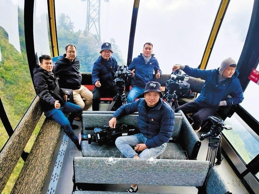 Nhóm phóng viên VNews trên cáp treo lên đỉnh Fansipan, Lào Cai để thực hiện chương trình đặc biệt chào năm mới 2024, với chủ đề “Khơi nguồn tài lực”, tháng 12/2023. Ảnh: TTXVN