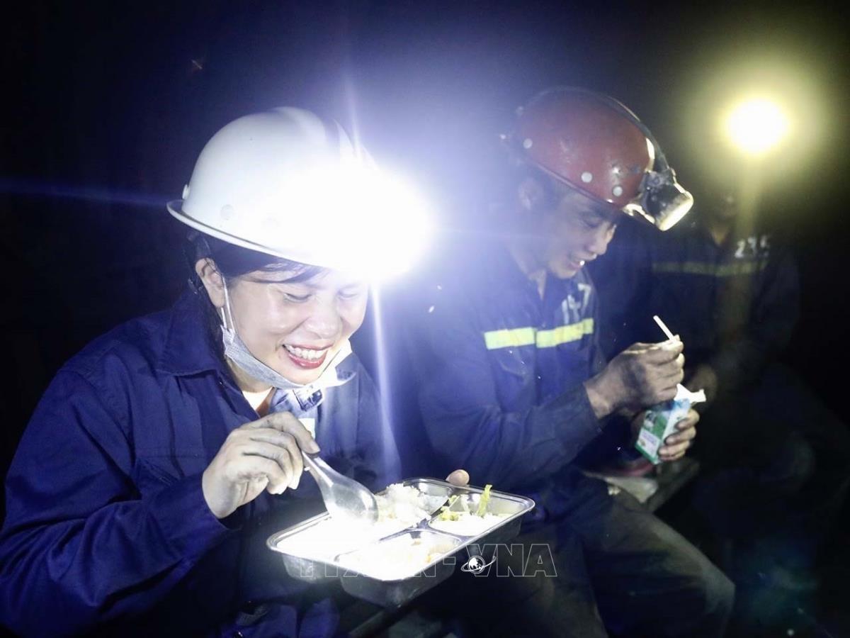 Phóng viên Thảo Nguyên của TTXVN và bữa cơm trưa muộn cùng thợ mỏ dưới hầm lò. Ảnh: TTXVN