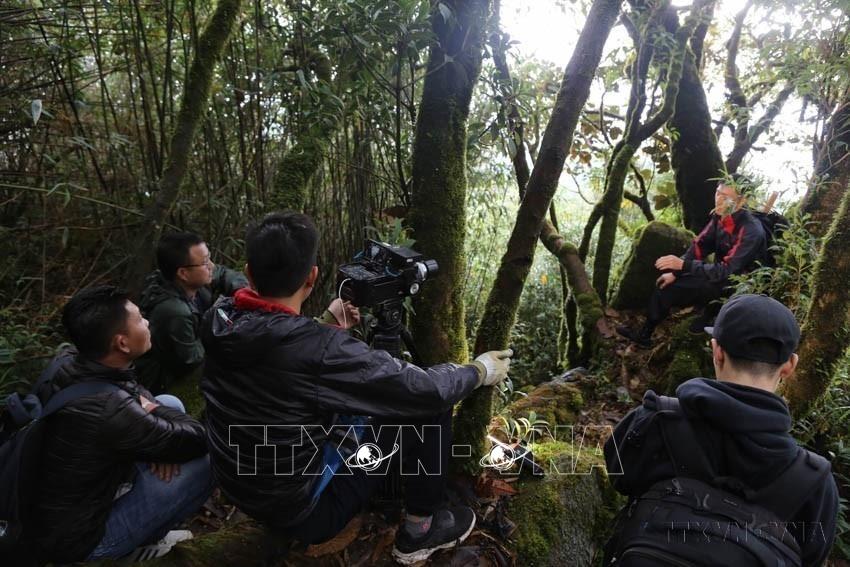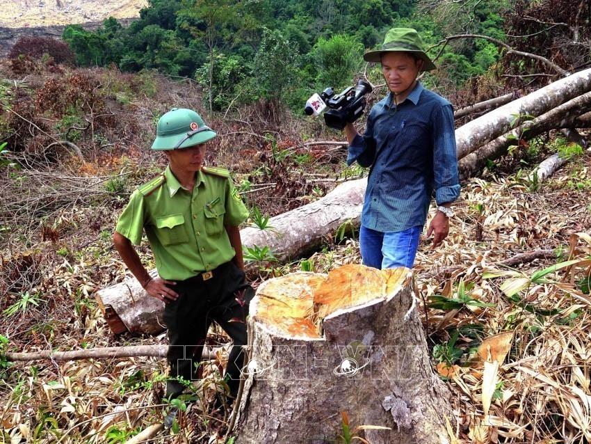 Phóng viên TTXVN tác nghiệp tại hiện trường về hoạt động bảo vệ rừng. Ảnh: TTXVN