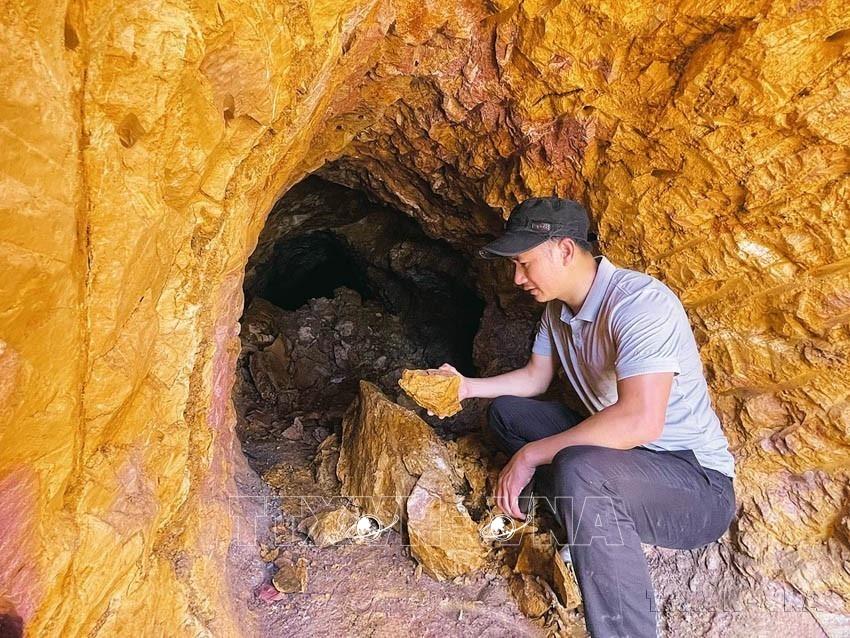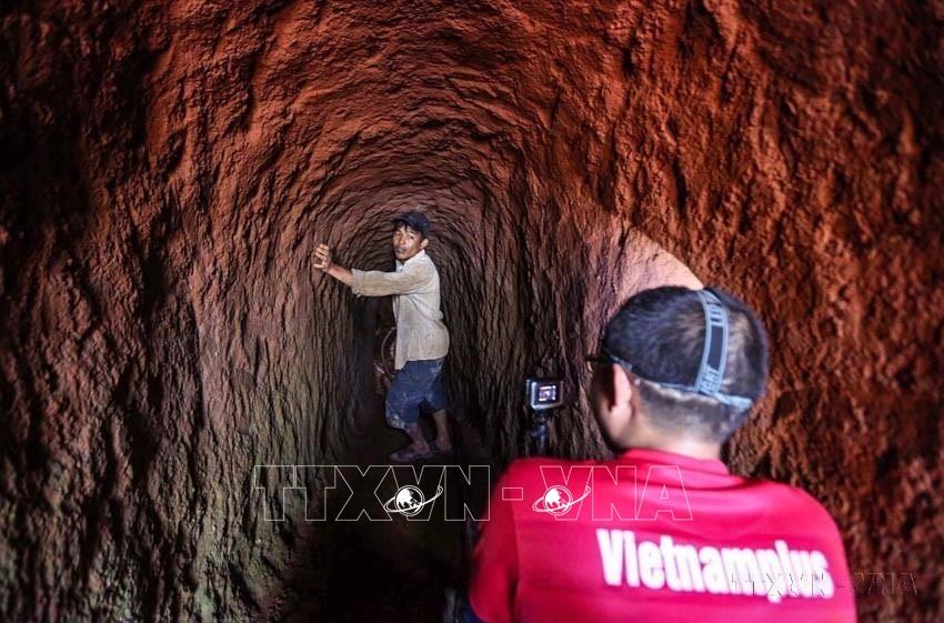 Phóng viên báo Điện tử VietnamPlus tác nghiệp tại hiện trường về vấn đề khai thác khoáng sản trái phép. Ảnh: TTXVN