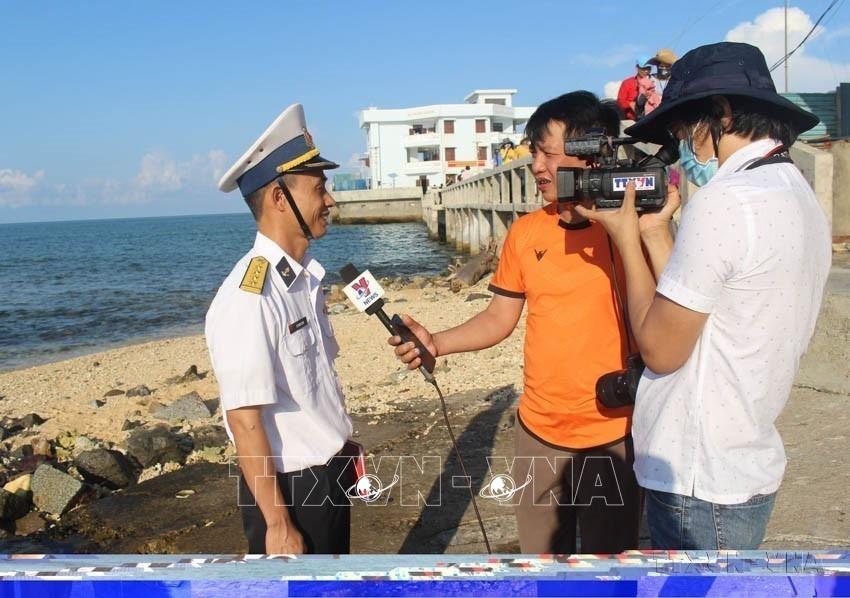 Các phóng viên Thắng Trung (cầm mic) và Sỹ Tuyên (TTXVN) quay phỏng vấn cán bộ hải quân trực tiếp làm nhiệm vụ canh gác bảo vệ trên đảo Đá Thị, Trường Sa hồi tháng 4/2021. Ảnh: Phan Sáu -TTXVN
