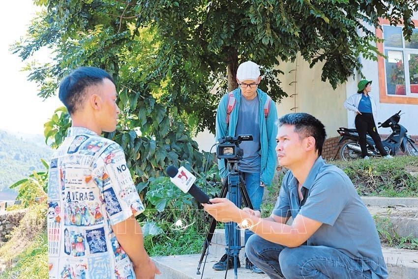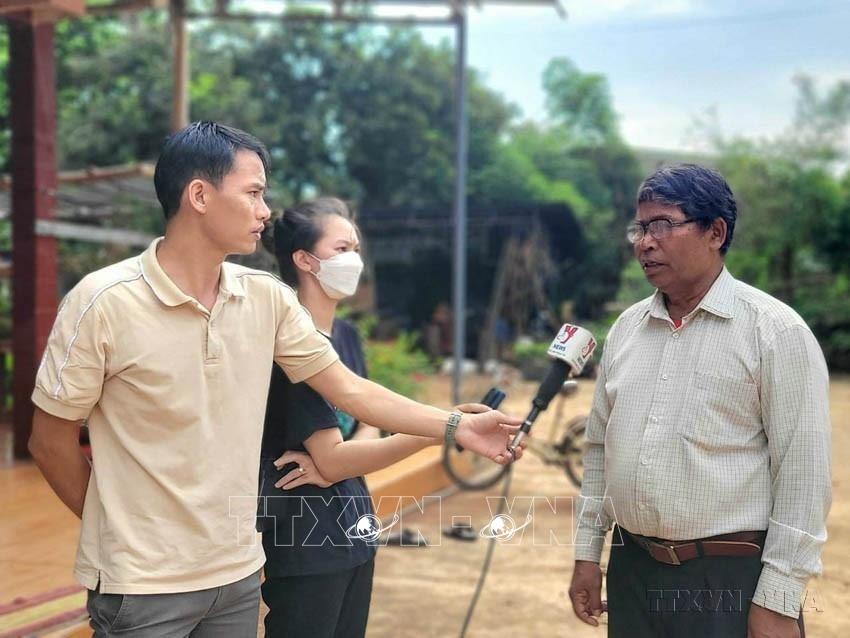 Phóng viên CQTT TTXVN tại Gia Lai Trần Quang Thái phỏng vấn mục sư Ae Smit (Y Djan EBan), người có uy tín tại xã Ea Ktur, huyện Cư Kuin, tỉnh Đắk Lắk, tháng 6/2023. Ảnh: TTXVN