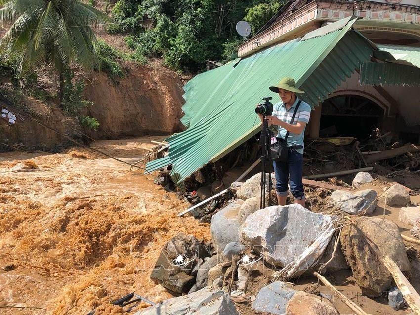 Phóng viên Cơ quan thường trú TTXVN tại Nghệ An Nguyễn Văn Tý ghi hình lũ quét tại huyện Kỳ Sơn, Nghệ An, tháng 10/2022. Ảnh: TTXVN