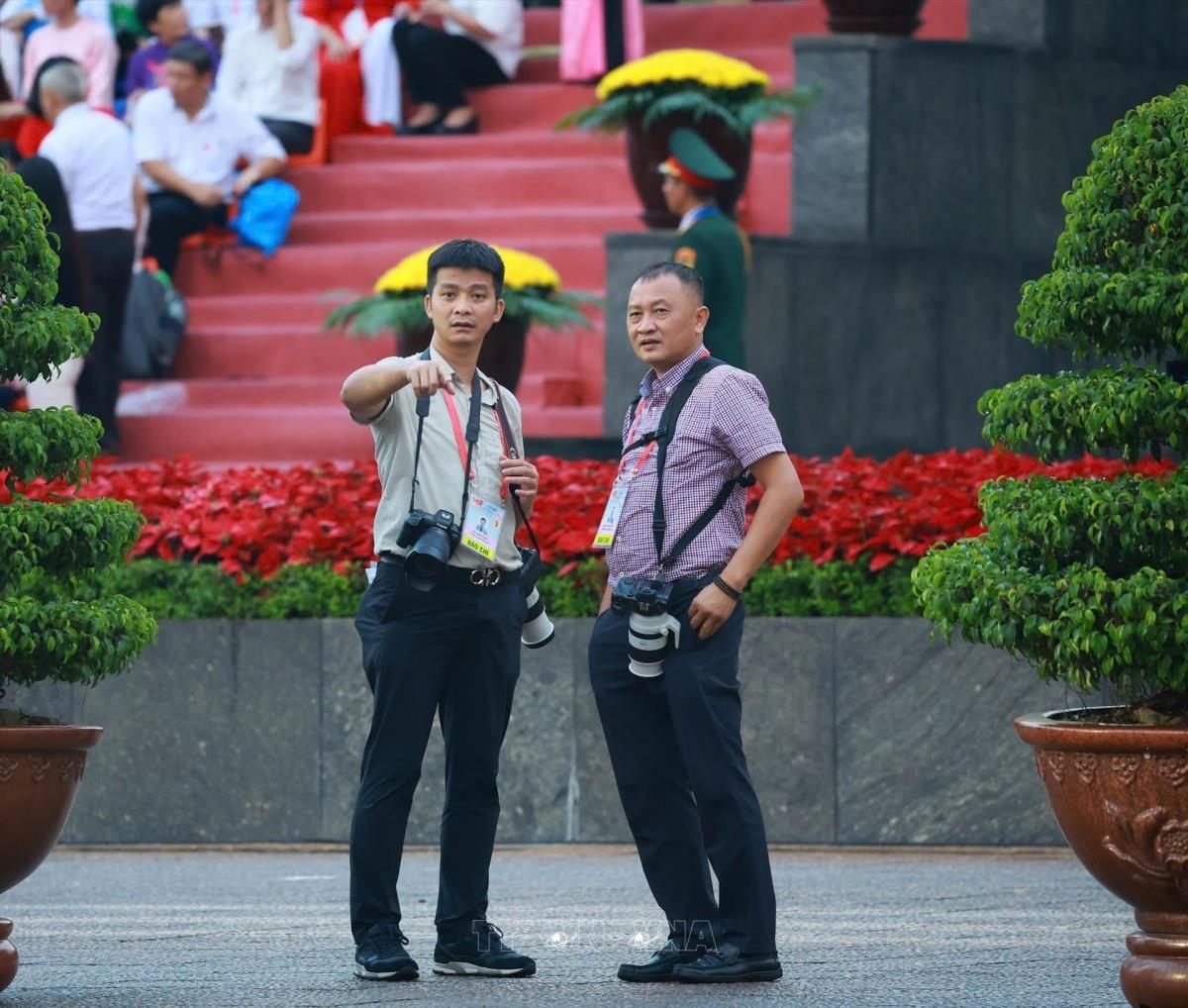 Các phóng viên Thống Nhất, Lâm Khánh (Ban Biên tập ảnh) trao đổi phương án tác nghiệp tại Lễ kỷ niệm, diễu binh, diễu hành 80 năm Cách mạng tháng Tám thành công và Quốc khánh nước CHXHCN Việt Nam (2/9/1945 - 2/9/2025). Ảnh: TTXVN