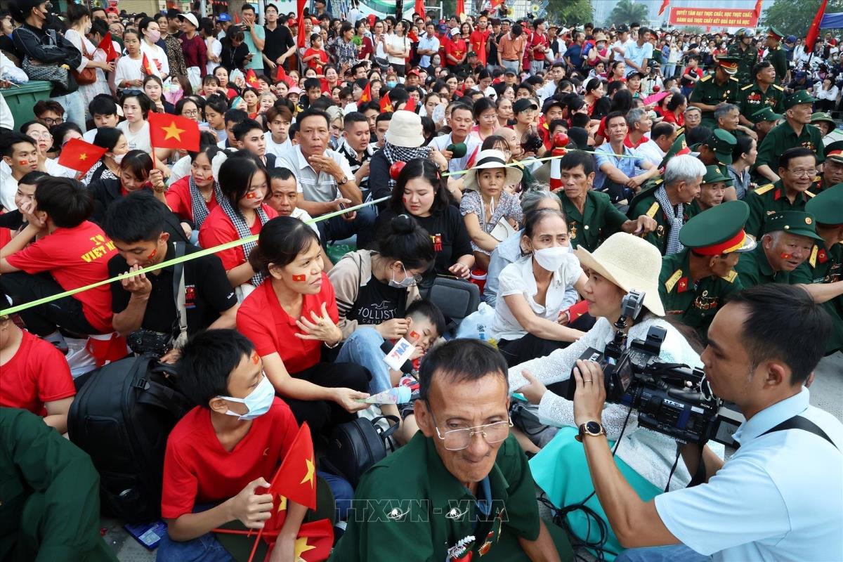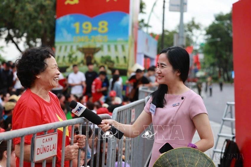 Phóng viên Trung tâm Nội dung số và Truyền thông TTXVN Nguyễn Thùy Ngân phỏng vấn người dân tại sự kiện kỷ niệm 80 năm Cách mạng tháng Tám thành công và Quốc khánh nước CHXHCN Việt Nam (2/9/1945 - 2/9/2025). Ảnh: TTXVN