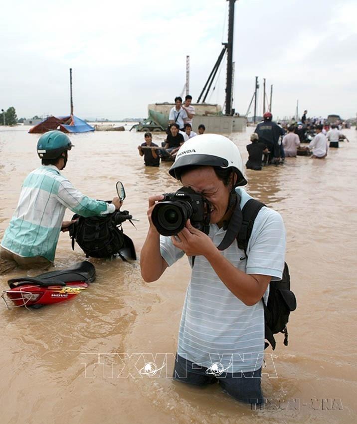 Phóng viên ảnh Huy Hùng tác nghiệp trên đường Láng - Hòa Lạc trong trận ngập lịch sử của Hà Nội (2008). Ảnh:TTXVN