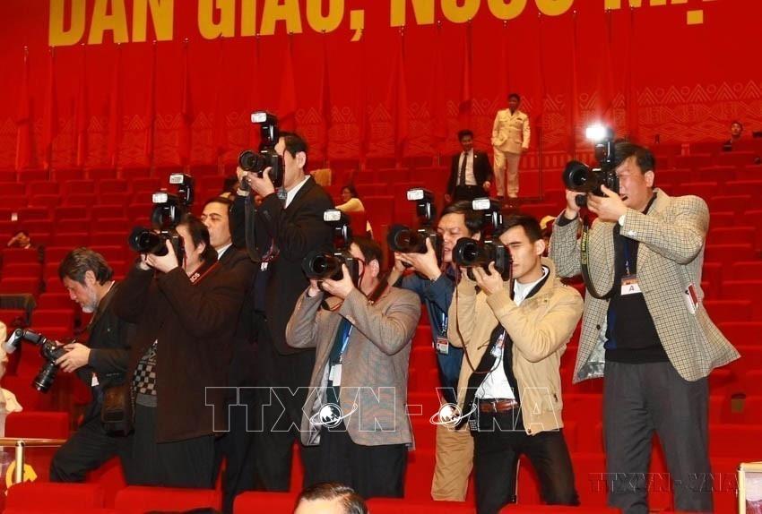 Phóng viên Ban Biên tập tin trong nước tác nghiệp tại họp báo Đại hội đại biểu toàn quốc Đảng Cộng sản Việt Nam lần thứ XIII. Ảnh: TTXVN
