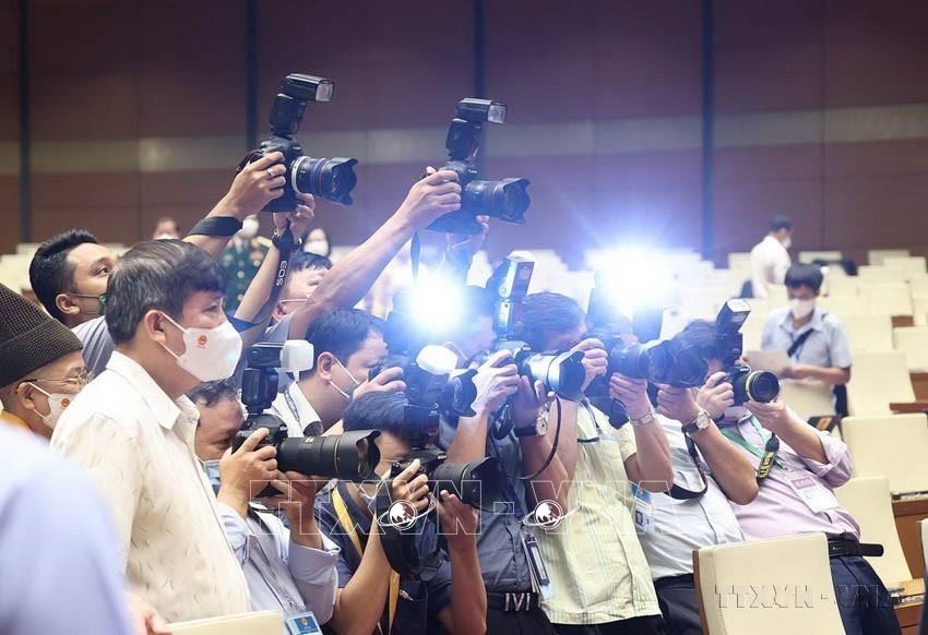 Nhóm phóng viên ảnh của TTXVN cùng các đồng nghiệp tác nghiệp tại Kỳ họp thứ nhất, Quốc hội khóa XV, tháng 7/2021. Ảnh: TTXVN