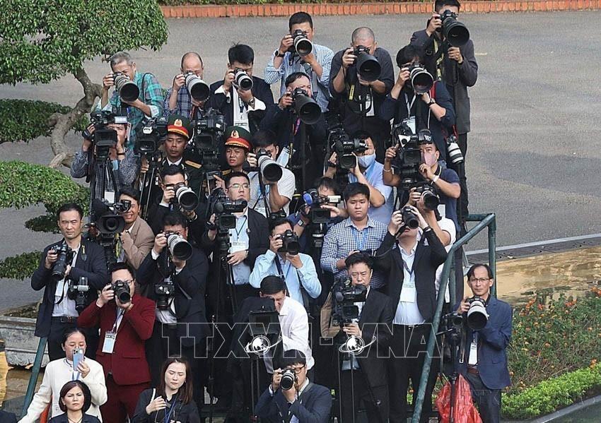 Phóng viên TTXVN cùng các đồng nghiệp tác nghiệp trong Lễ đón Tổng Bí thư, Chủ tịch nước Trung Quốc Tập Cận Bình tại Phủ Chủ tịch, tháng 12/2023. Ảnh: TTXVN