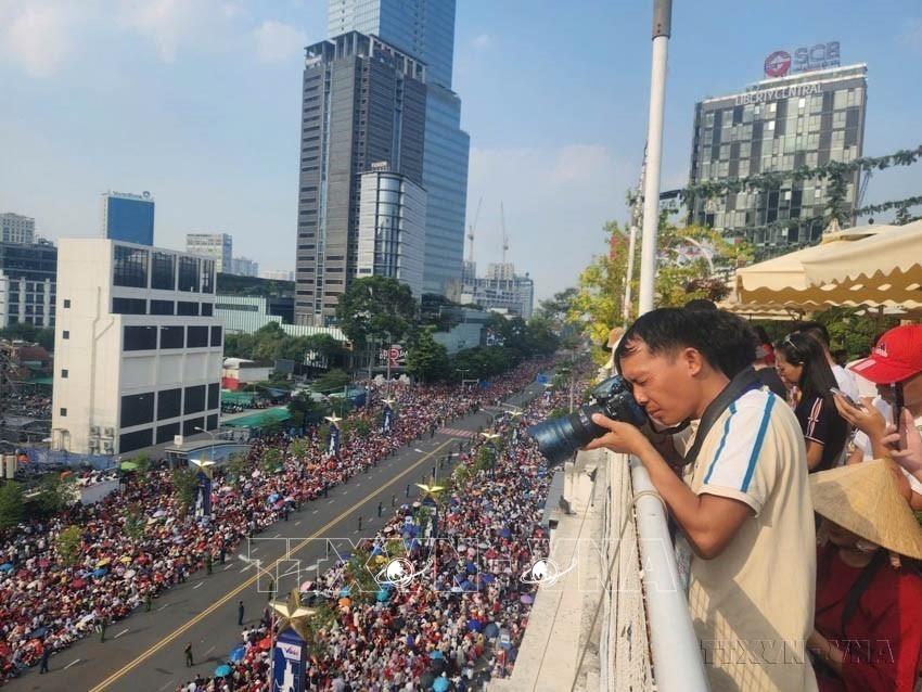 Phóng viên Mạnh Linh (báo Tin Tức và Dân tộc) tác nghiệp tại Lễ kỷ niệm 50 năm Ngày Giải phóng miền Nam, thống nhất đất nước (30/4/1975 - 30/4/2025). Ảnh: TTXVN