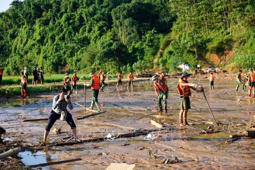 Phóng viên Dương Giang (Ban Biên tập ảnh) tác nghiệp tại khu vực sạt lở đất thuộc làng Nủ, xã Phúc Khánh, huyện Bảo Yên, tỉnh Lào Cai (2024). Ảnh: TTXVN