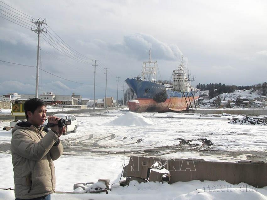 Phóng viên Đào Thanh Tùng, Cơ quan thường trú TTXVN tại Tokyo (Nhật Bản), tác nghiệp tại vùng thảm họa ở tỉnh Iwate, tháng 2/2012. Ảnh: TTXVN