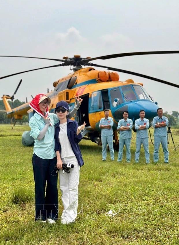 Phóng viên Trần Hiền Hạnh (Ban biên tập tin Trong nước) và phóng viên Thu Phương (Trung tâm Nội dung số và Truyền thông) tại Sân bay Hòa Lạc để phản ánh công tác chuẩn bị cho sự kiện A80 của lực lượng không quân, tháng 8/2025. Ảnh: TTXVN