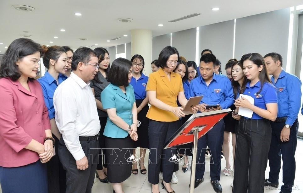 Lãnh đạo TTXVN cùng các đoàn viên quét mã QR công trình thanh niên “Chuyển đổi số trong giới thiệu các khu di tích của TTXVN”. Thông tin về những di tích lịch sử, khu tưởng niệm của TTXVN được tích hợp trong mã QR dưới dạng các bài megastory và video với nội dung phong phú, trình bày hấp dẫn. Ảnh: TTXVN