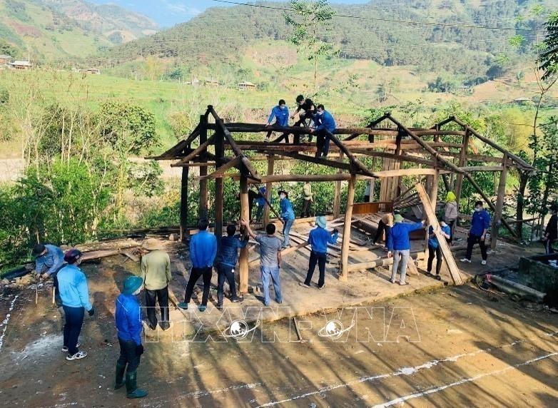 Hưởng ứng phong trào xóa nhà tạm, nhà dột nát, Đoàn viên thanh niên tỉnh Yên Bái hỗ trợ người dân tháo dỡ nhà và dựng nhà mới. Ảnh: Tiến Khánh – TTXVN