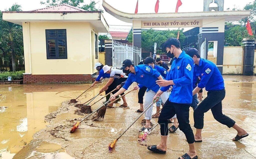 Đoàn viên thanh niên dọn dẹp vệ sinh, cào đẩy bùn non tại các điểm trường bị ảnh hưởng nặng trên địa bàn huyện Quảng Ninh, tỉnh Quảng Bình (11/2024). Ảnh: TTXVN phát