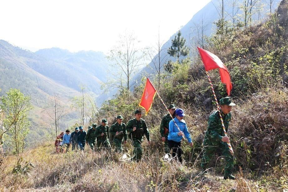 Đoàn viên, thanh niên huyện Đồng Văn, tỉnh Hà Giang phối hợp cùng cán bộ, chiến sĩ Đồn Biên phòng Lũng Cú tuần tra, bảo vệ đường biên, cột mốc biên giới (3/2024). Ảnh: Minh Đức - TTXVN