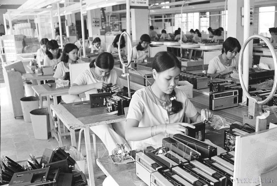 Các nữ thanh niên xưởng lắp máy thu thanh vô tuyến truyền hình National Sài Gòn hăng say lao động phục vụ nhân dân. Ảnh: Văn Bảo - TTXVN