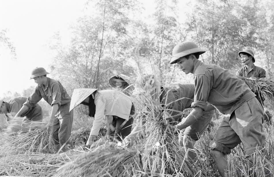 Các chiến sĩ trẻ tiểu đoàn 74 pháo binh tỉnh Quảng Nam giúp dân thu hoạch lúa. Ảnh: TTXVN