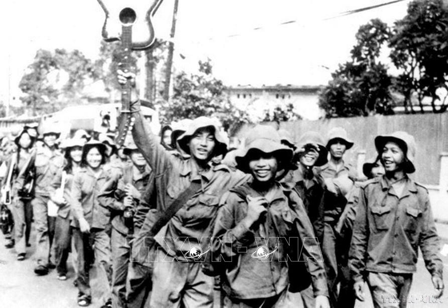 Các chiến sĩ giải phóng phất cao lá cờ chiến thắng trên sân bay Tân Sơn Nhất trong chiến dịch Hồ Chí Minh, giải phóng hoàn toàn miền Nam, thống nhất đất nước, ngày 30/4/1975. Ảnh: Quang Thành – TTXVN