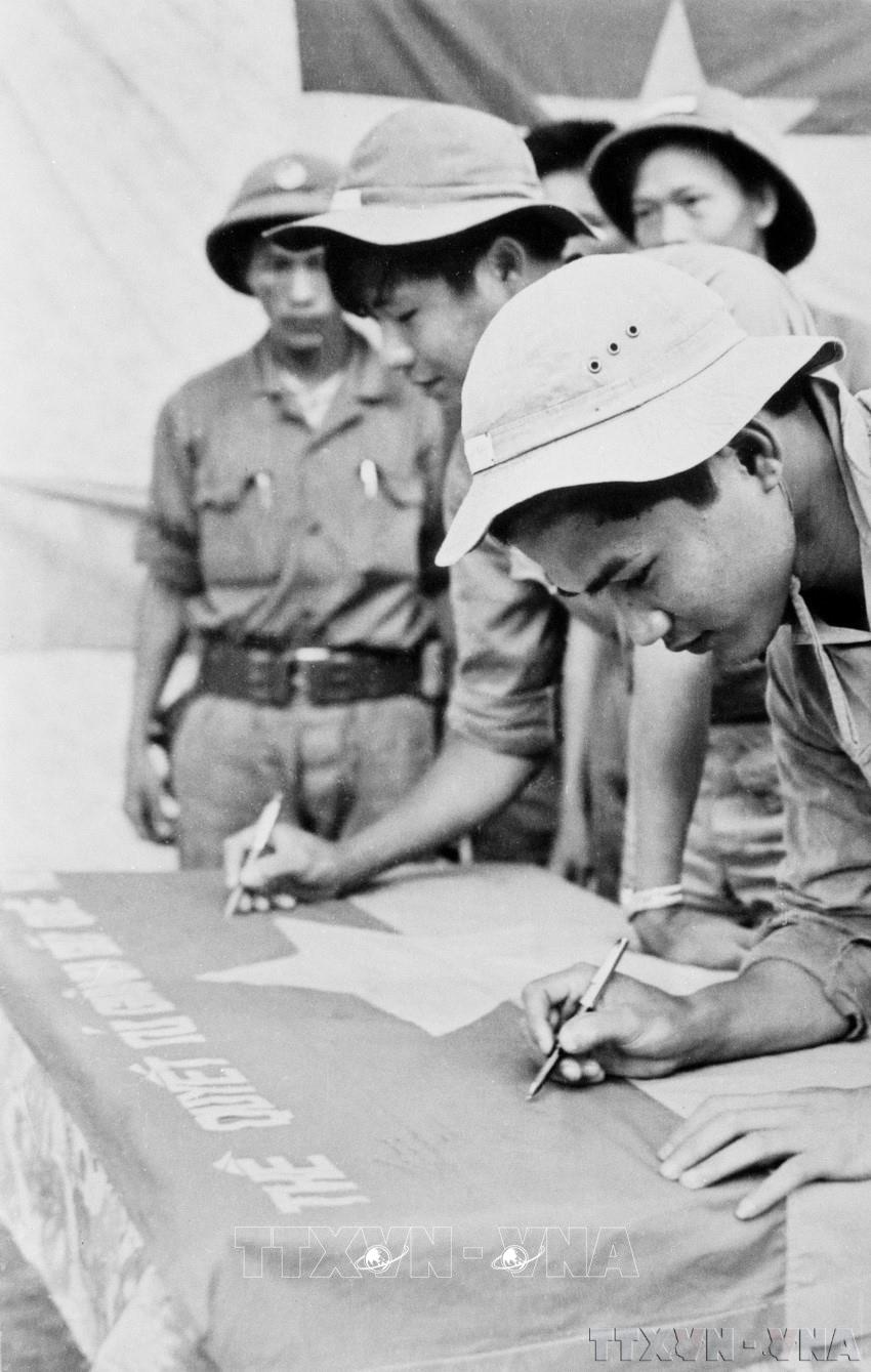 Các chiến sĩ tổ mở cửa quân giải phóng Quảng Ngãi ký tên lên lá cờ thề quyết tử giành giữ quê hương, trước khi mở màn vào chiến dịch mùa Xuân 1975. Ảnh: Thanh Tụng – TTXVN