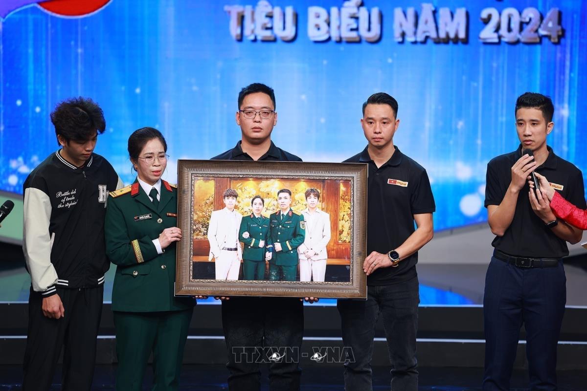 Phùng Quang Trung, gương mặt trẻ Việt Nam tiêu biểu năm 2024 và nhóm phục dựng ảnh Skyline trao bức ảnh phục dựng cho gia đình liệt sĩ Tăng Bá Hưng. Nhóm đã phục dựng hàng nghìn bức ảnh liệt sĩ nhằm tri ân những người đã hy sinh vì độc lập, tự do của Tổ quốc, góp phần cùng xã hội thực hiện nghĩa cử “Đền ơn đáp nghĩa”. Ảnh: Dương Giang - TTXVN