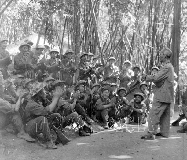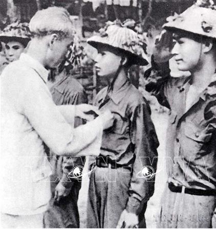 Chủ tịch Hồ Chí Minh tặng Huy hiệu “Chiến sĩ Điện Biên Phủ” cho những chiến sĩ trẻ đã lập công xuất sắc trong Chiến thắng lịch sử Điện Biên Phủ "lừng lẫy năm châu, chấn động địa cầu", tháng 5/1954. Ảnh: TTXVN