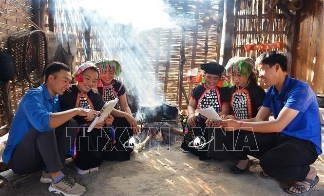 Đoàn viên, thanh niên huyện Mường Nhé, tỉnh Điện Biên tuyên truyền đường lối chính sách của Đảng, Nhà nước với đồng bào dân tộc Sila tại bản Nậm Sin, xã Chung Chải. Ảnh: Minh Đức – TTXVN